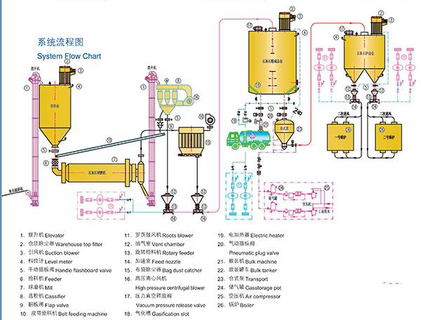 幹法脫硫係統 工藝流程 來自破碎機破碎後的石灰石顆粒經提升機提升至原料倉,經下方的給料機定量的將石灰石顆粒加入到石灰石球磨機內,給料量即可通過變頻器變頻調速,也可以通過螺旋稱給料機進一步實現給料量的調節。經球磨機粉碎後的物料一部分細的粉塵直接進入除塵器進行收集,一部分經提升機
